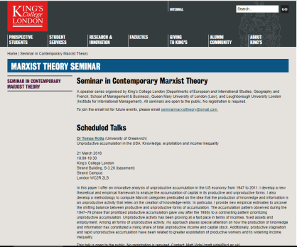 On March 21st 2018 I gave a lecture titled “Unproductive Accumulation in the USA” at King’s College London (KCL). This lecture was part of the Seminars in Contemporary Marxist Theory that takes place monthly at KCL.