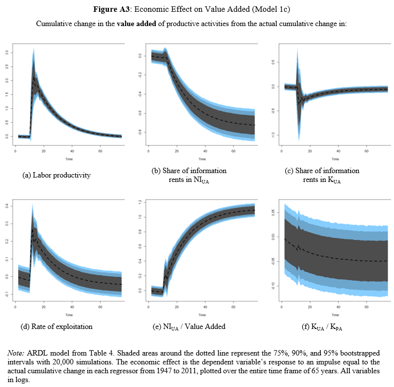 In this paper I estimate the impact of unproductive activities on economic growth, labor productivity, and income inequality in the United States from 1947 to 2011. Productive activities directly create value, while unproductive activities do not. I develop a new methodology to compute the growth of productive and unproductive activities in terms of flows of income and stocks of fixed assets using input-output matrices and national income accounts. A core feature of my methodology is the notion that the commodification of knowledge and information gives rise to “information rents”. Information rents are, as I demonstrate, a determinant factor of growth and distribution. I find that unproductive activities have a net positive effect on economic growth and labor productivity, but at the price of increasing income inequality. Unproductive activities that rely on information rents, in particular, have increased income inequality and slowed down valued-added growth despite their positive contribution to labor productivity. Information rents have drawn too much value from productive activities and benefitted the top income earners.