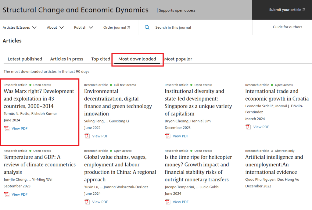 My paper with Rishabh Kumar on the relevance of Marx today just got published in the journal Structural Change and Economic Dynamics (SCED). The paper and the supplementary material including our new panel dataset of Marxist variables are available open access. Read my tweet about the paper.