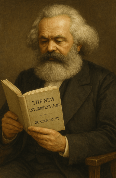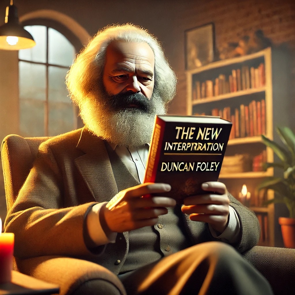 The wonders of Chat GPT Plus, version 4o. I have asked the premium version of Chat GPT to generate an image of Karl Marx reading a (hypothetical) book titled “The New Interpretation” written by professor Duncan Foley. Here are the results: