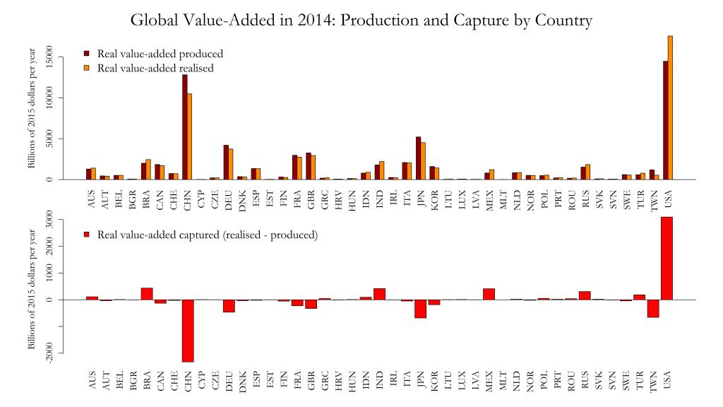 The paper estimates the production, realisation, and capture of economic value in the world economy from 2000 to 2014. Estimates show how value is produced and transferred across 56 sectors and 43 countries. The methodology builds on the Marxian literature and the productive-unproductive classification. Value production is the labour directly and indirectly required to produce goods and services within global value chains. Value capture is the deviation between value realisation and production. Results show that China is the largest giver of value while the USA is the largest capturer of value in the world economy. Unproductive activities (real estate, finance, and trade) and capital-intensive industries (manufacturing, mining, and oil) are value capturers. Labour-intensive industries (health, education, construction, agriculture, and services) transfer value away. The paper also demonstrates that the theory of unequal exchange is incompatible with the conventional assumption that all activities are productive. Only under the Marxian productive-unproductive classification do the results converge with unequal exchange theory.